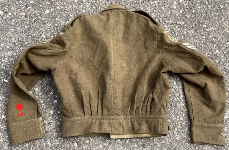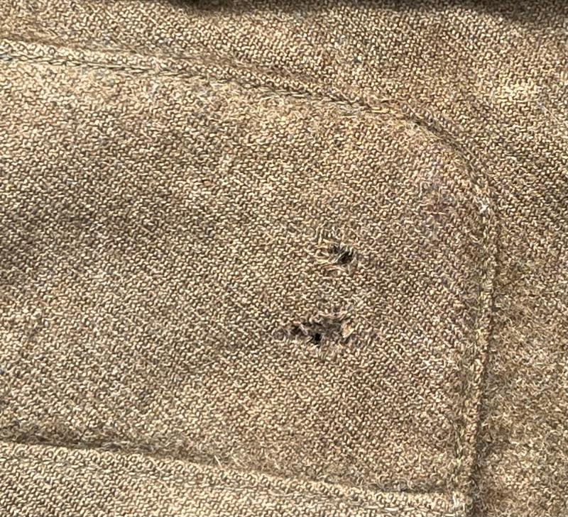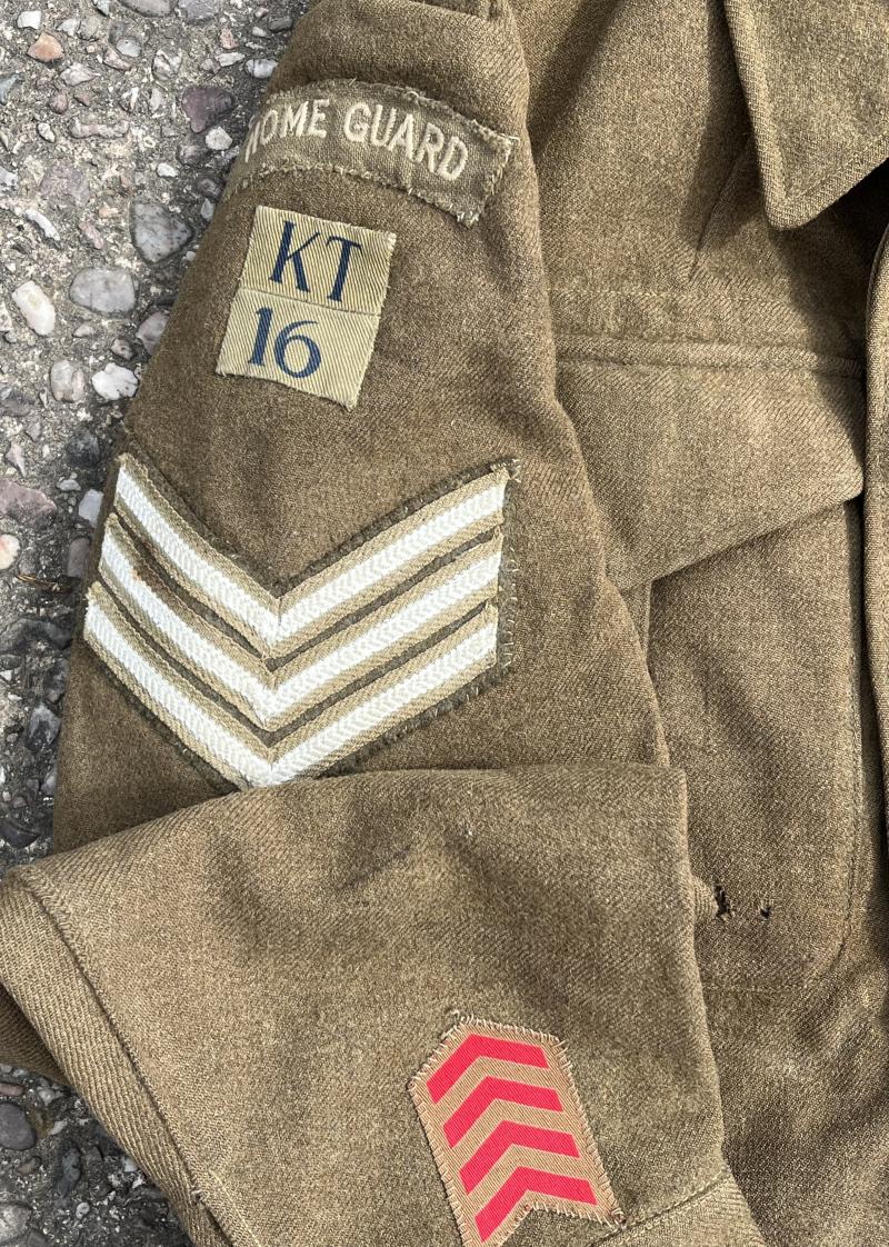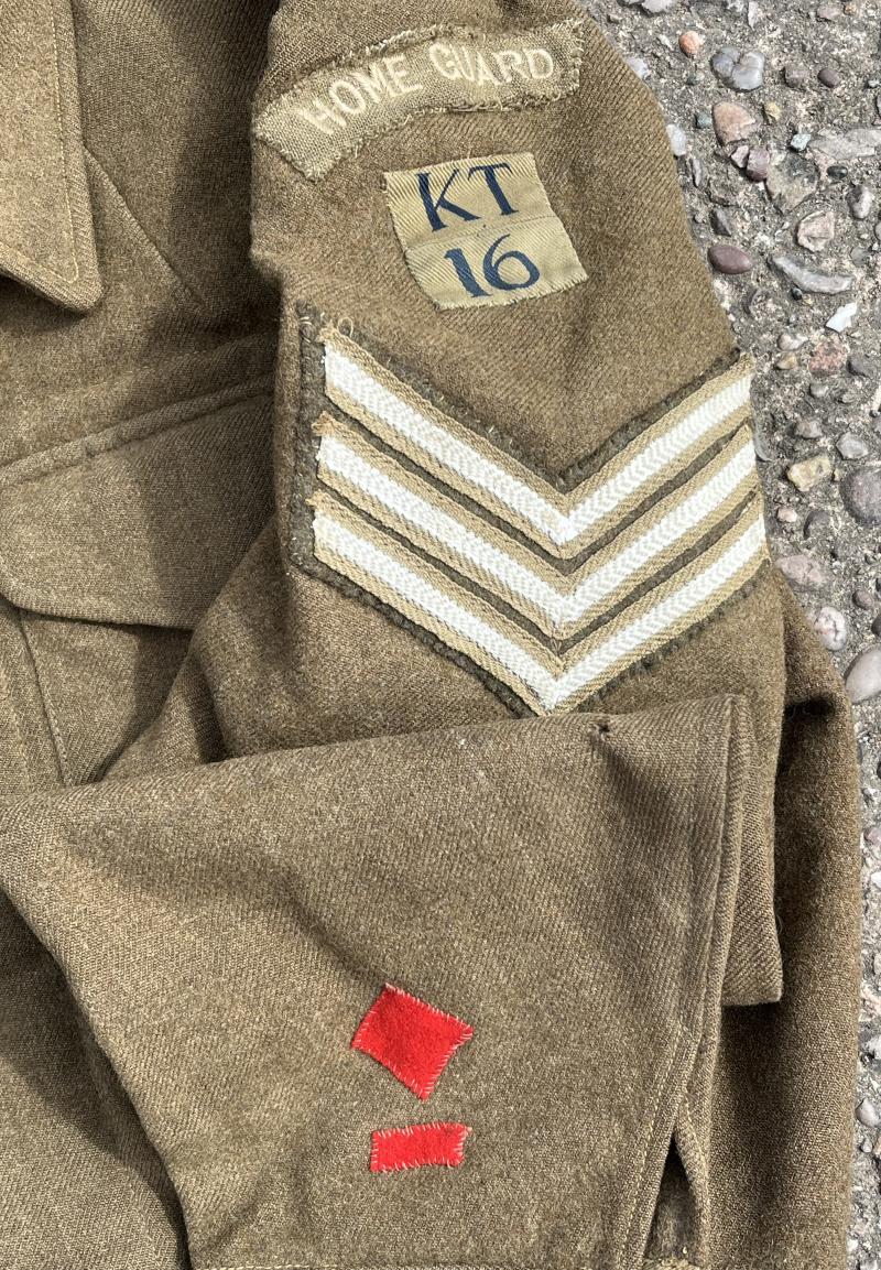 40 Pat. Battledress Blouse bearing the insignia of the 16th Kent (Gravesend) Battalion, in the form of printed ' KT16 ' shoulder titles. Whitened Sergeant stripes to both arms with a Home Guard proficiency badge to one sleeve and printed war service chevrons to the other. Manufacturer's label present but now illegible with inspection marks indicating manufacture in 1940, an approx. size 11 - 40" chest. This example was recently recovered from a house and is a little dusty and has two small areas of moth damage to the lower r/h pocket and the l/h elbow, otherwise untouched condition.