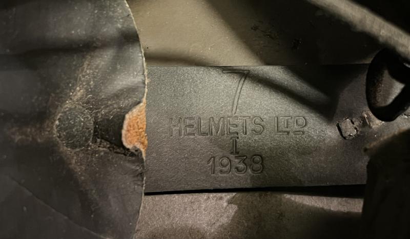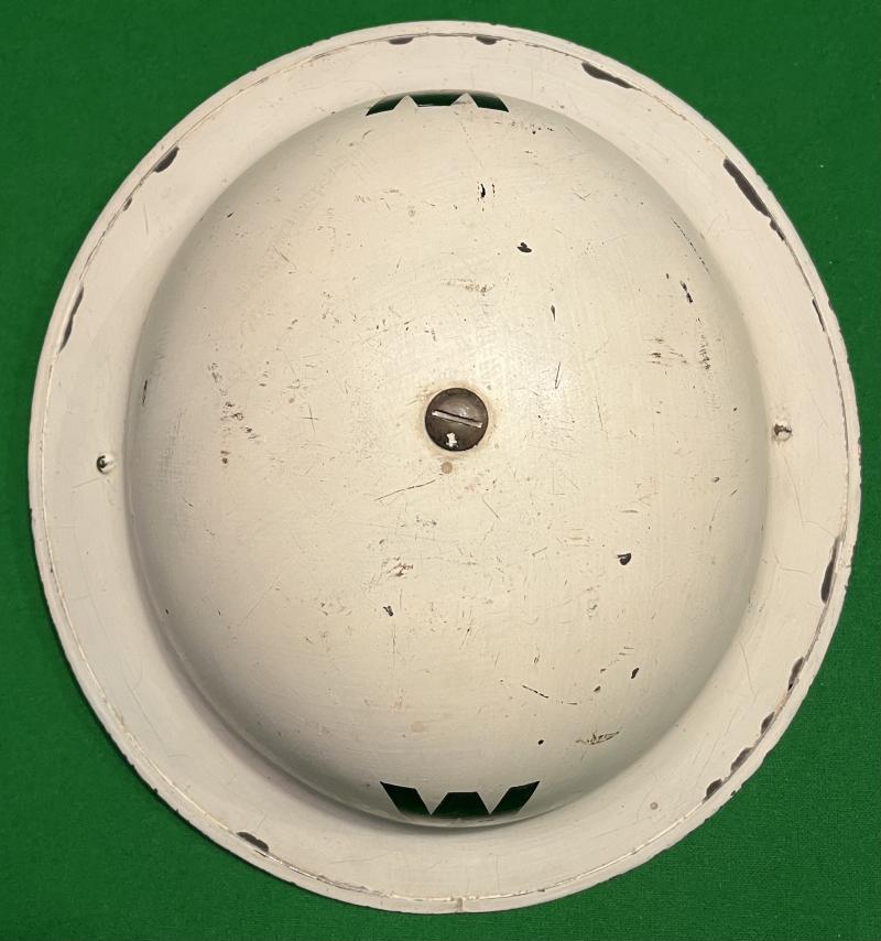 1939 dated MkII helmet by BMB ( Briggs Motor Bodies ) with MkI liner, white painted with black W to front and rear indicating the junior supervisory rank of Post Warden. Size 7, 1938 dated liner by Helmets Ltd with chin strap with initials and a name inked to interior. Above average condition with minor scuffs and marks.