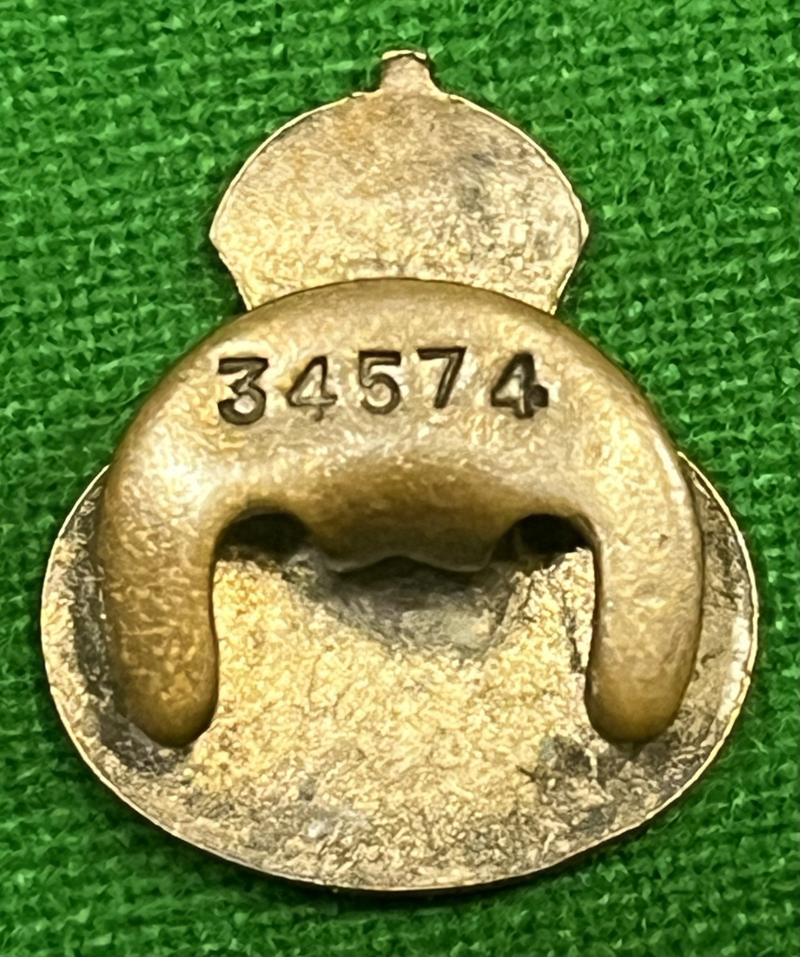 Silver gilt and enamel lapel badge for the Ulster Home Guard for wear in civilian clothes. Some sources suggest that this is official issue, weight being given to this arguement by an issue number to the reverse. Badge in used, clean condition with some abrasions and stress lines which look worse in photographs than in reality and wear to silver gilt.