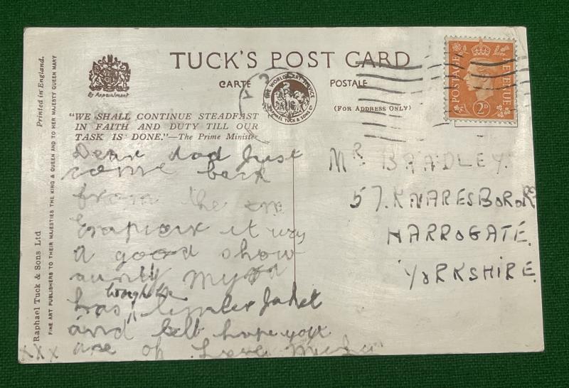 Comic postcard featuring the work of the artist ' Dinah 'and one of her trademark children with an ITMA theme using one of their catchphrases ' Shall I do you now Sir ? '. Postally used in good, condition with patriotic Churchillian exhortation to reverse.