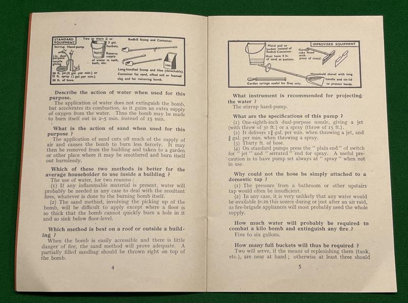 C1941 ' The Fire-Party's Handbook ' by R.F.Reynolds and others. 16pgs dealing with the specific threat posed by the incendiary bomb and the actions needed to combat them. Illustrated throughout with sketches and diagrams. Excellent clean condition