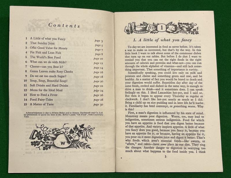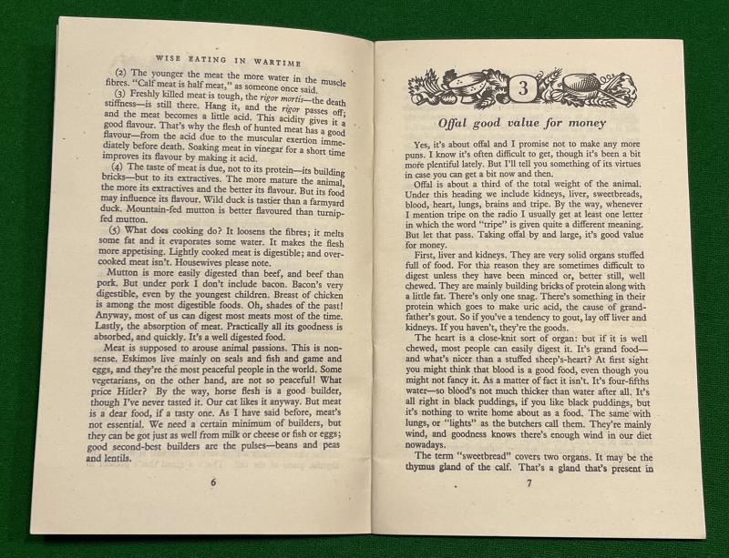 1943 Ministry of Food booklet ' Wise Eating in Wartime '. 32pgs containing the contents of radio talks given by Dr Charles Hill, the ' Radio Doctor ' , concerning the wartime diet for adults. He talks of making the most of the rations, balanced diets and showing the part played by simple food groups in maintaining health. Excellent, clean condition.