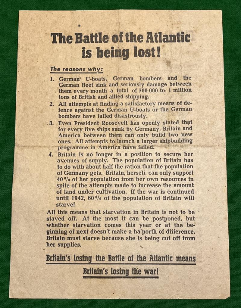 German air-dropped propaganda leaflet ' The Battle of the Atlantic is being lost ! ' Double-sided A5 leaflet designed to sow doubt and fear among the British public, suggesting their efforts in the Atlantic were failing. Leaflets were reported as having been dropped in June 1941 over East Anglia and Southampton and over Bristol and Wales in July of the same year.
