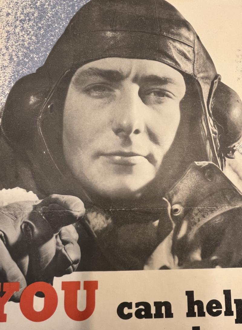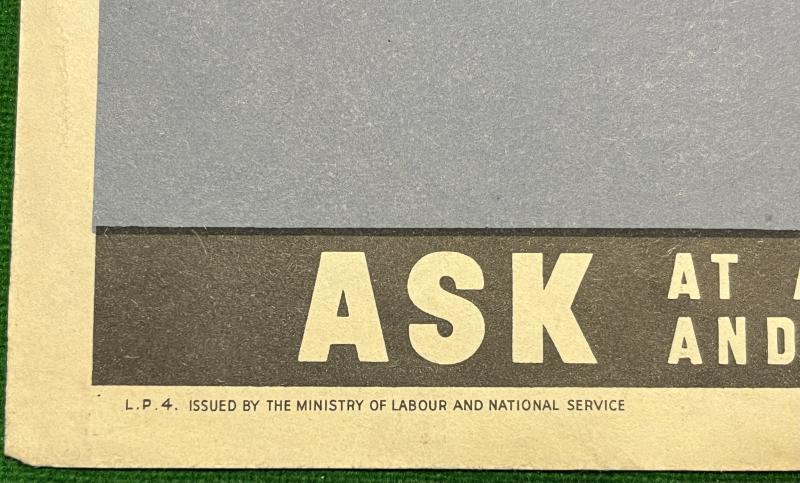 25 x 38cms poster issued by the Ministry of Labour and National Service calling for recruits to the aviation industry. With allusions to the famous WW1 recruiting poster featuring Kitchener but replaced by the head of a pilot. Printed for the HMSO by J.Weiner, London. Good, clean condition, has been folded.
