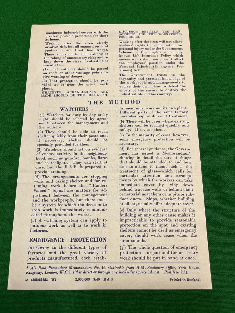 1940, double-sided leaflet issued by the Ministry of Home Security setting out conditions to try and alleviate the disruption caused by air raids. Good, clean condition, has been folded.