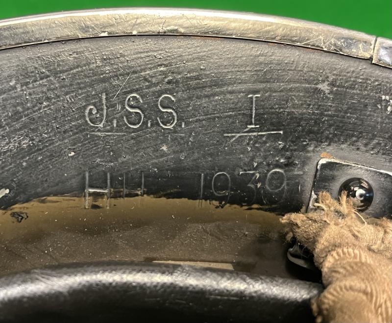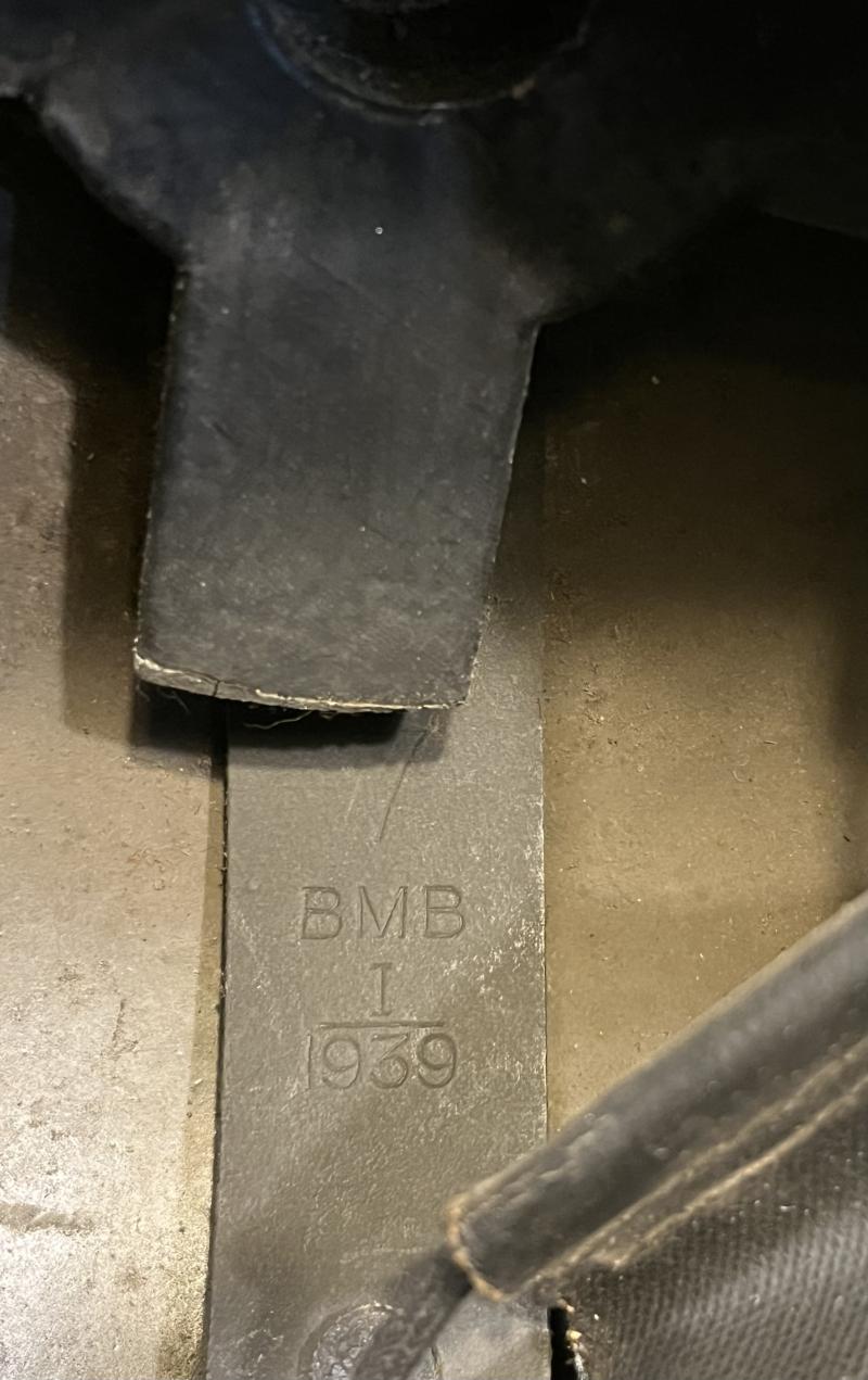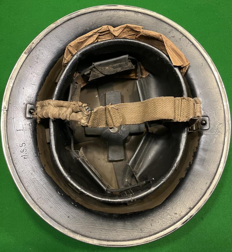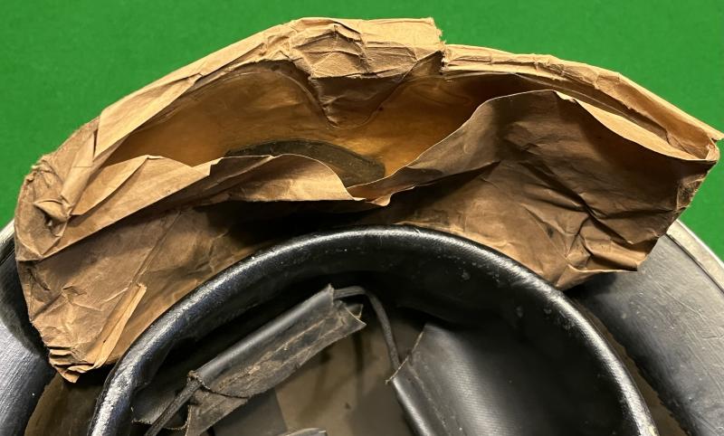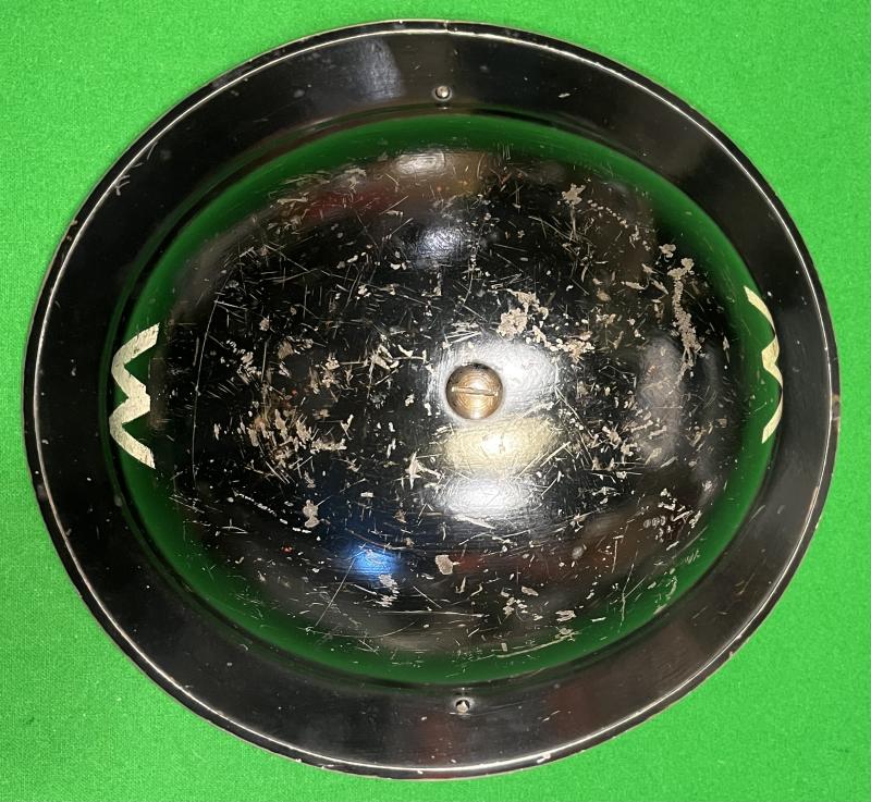 An above average example of a MkII helmet worn by an ARP Warden. Shell by J.S.S. ( Joseph Sankey & Sons ), dated 1939 with a size 7, 1939 dated Mk I liner by BMB ( Briggs Motor Bodies ). Neatly stencilled ' W ' to front and rear featuring a high gloss black finish. The original owner has pushed an envelope with some acetate gas goggles between the lining ready for use.With some scrapes and rubs this remains one of the better examples .