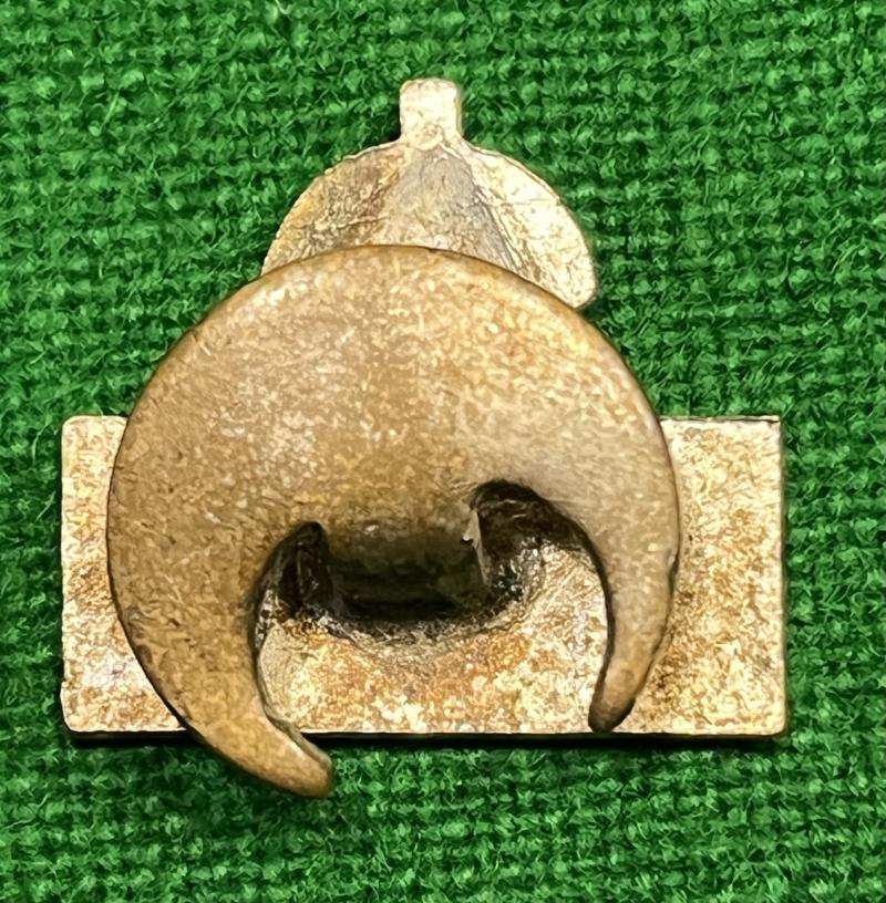 Silver gilt and enamel, half moon fixing lapel badge. This badge is a variation on the standard HG lapel featuring the words ' Home Guard ' in a rectangular box. Normally these badges are finished in gilt ( See item: 13785 ), this however, has a silver gilt finish. Good, used condition.