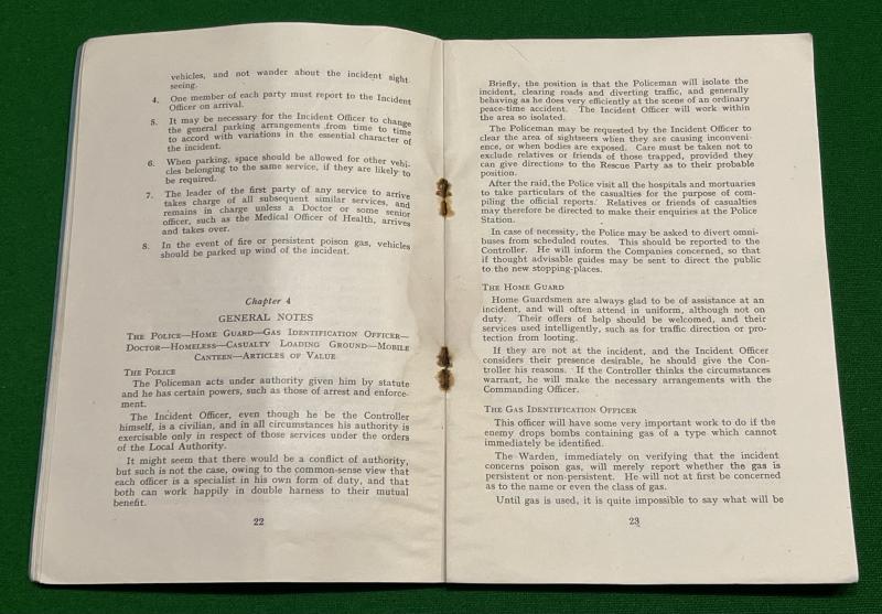 1942 ' The Conduct of A.R.P.Incidents ' by T.E.Browne, a guide for the Civil Defence Services. 48pgs outlining the management of an incident ' based on practical Blitz experiences '. Good, used condition with some minor rust staining to staples. Uncommon.