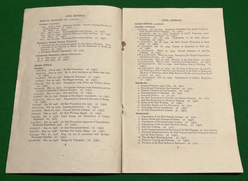 Published and revised to August 1939 by HMSO ' Publications on Civil Defence ' this 10pg pamphlet covers all Handbooks, Memoranda and Circulars. Also includes publications by the Scottish Office and various other Parliamentary departments. Good, slightly foxed condition. Useful and uncommon reference and is a good indication of the level of preparedness at the outbreak of war.