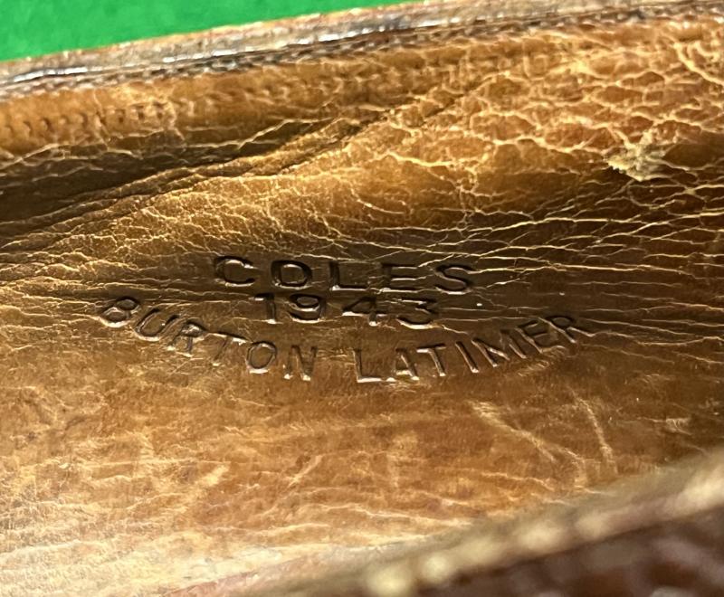A scarce pair of original British Women's Land Army shoes made in 1943 by Coles of Burton Latimer, Northamptonshire. Made from a brown coloured leather featuring a pebbled finish with five eyelets and no toe cap. Leather sole and heel with a metal horseshoe, marked to the instep with the size: 6 1/2 L, the initials 'WLA' and the notation ' PLEASE GREASE ME '. Displaying some light use and in a good wearable size.