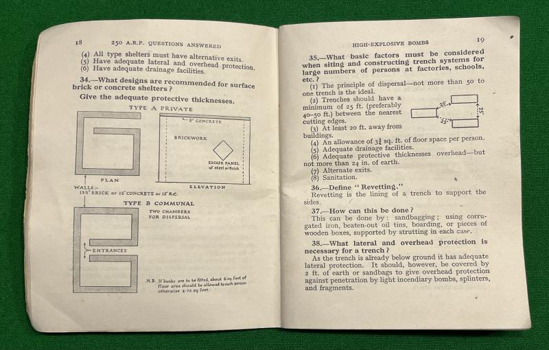 1943ed. ' 250 Questions Answered ' by R.F.Reynolds and J.M.Young. 75pg booklet dealing with HE and Incendiary bombs, war gases and first aid. Some diagrams. Good, used condition with light creasing, marking etc.