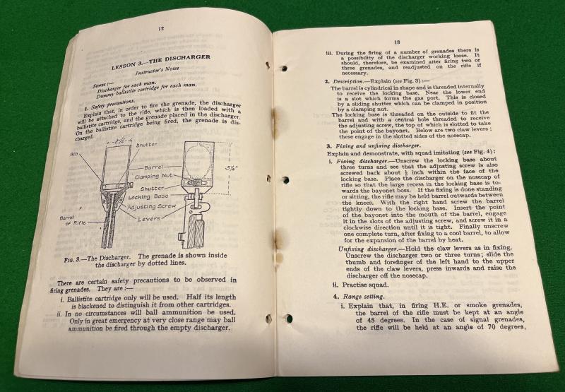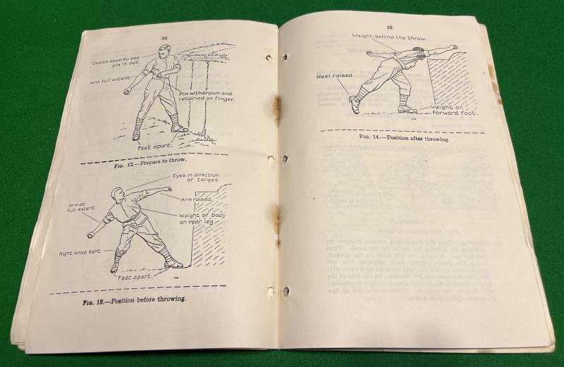 1937ed. SAT Vol.1 No.13 Grenade and amendments. 48pg manual covering the No.36 grenade, the cup discharger and the use of the grenade. Illustrated throughout with sketches and diagrams. This example has an ownership stamp for ' 11th Maidstone Batt Kent Home Guard No.2 Kent Group ' and a Jun.1941 issue date. Good, used condition with replaced staples and some rust staining.