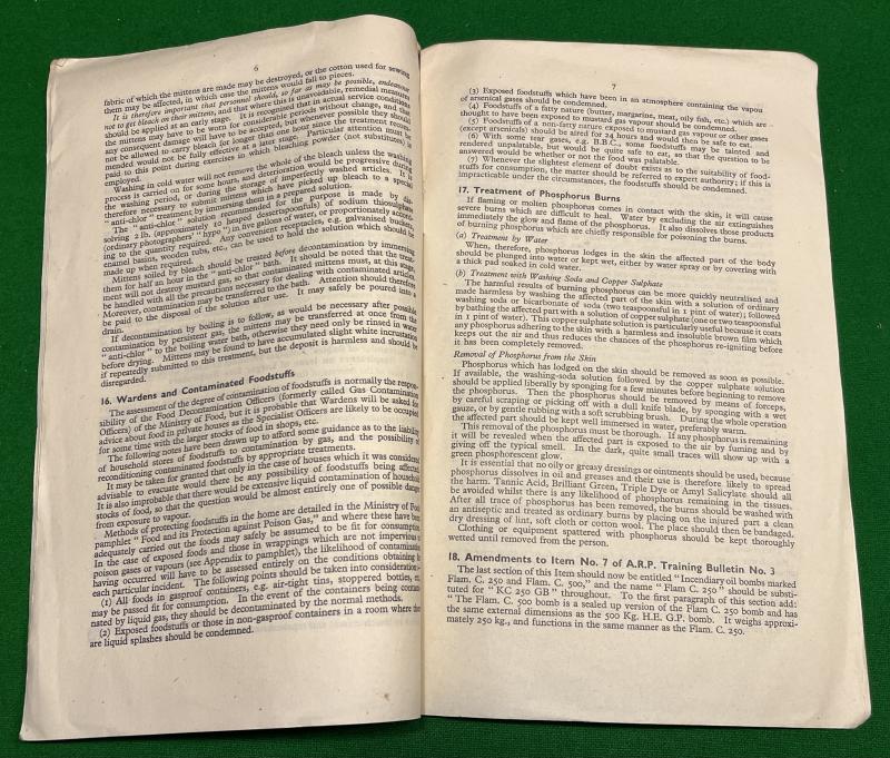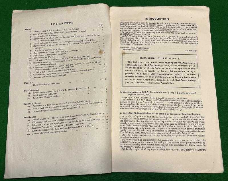 1942/1943ed. Min. of Home Security Civil Defence Training Bulletin No.9. 12pg pamphlet giving updates and new information regarding all subjects of Civil Defence including gas notes for Wardens, Incendiary bombs, Morrison shelters, Livestock Emergency Service. Good, used condition with some light marking.