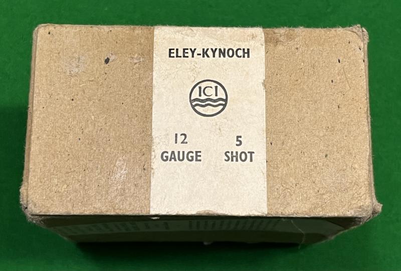 Cardboard carton that once contained 25 x 12 Bore cartridges made by Eley-Kynoch. These specific cartridges contained 5 shot, a heavier load designed for defensive use with shotguns. Carton marked ' War-time issue ' and in generally good used condition with light marking, creasing etc.