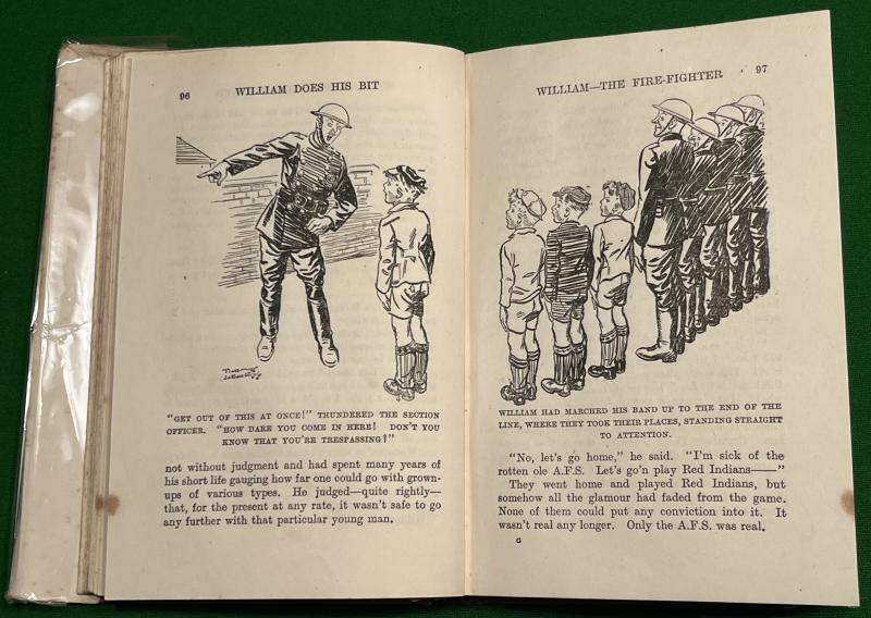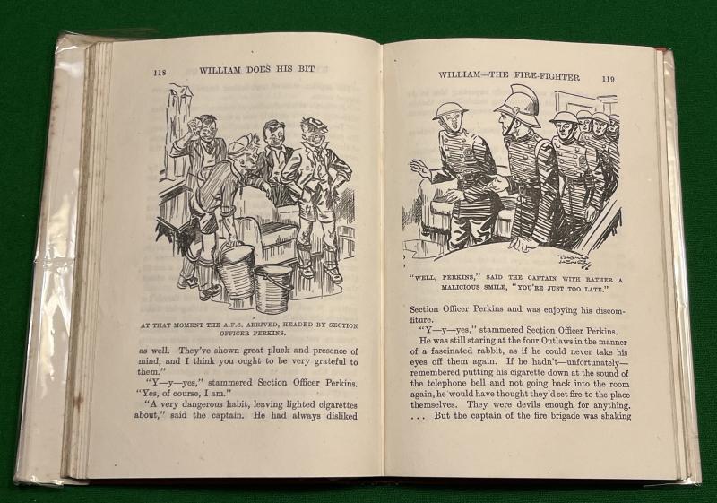 19421st reprint, ' William Does His Bit ' by Richmal Crompton. The irrepressible character William does his best for the War effort in 252pgs with the occasional b/w sketch illustration. This example is complete with it's scarce colourful dustwrapper featuring William with a stirrup pump! In good clean condition with a chipped and marked d/w with some contemporary inscriptions.