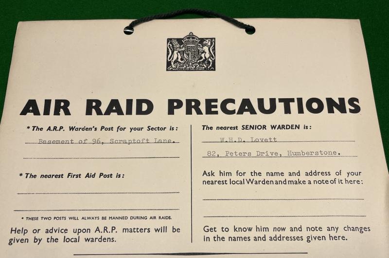 Information card designed to be filled in with local information about the location of warden's posts, first aid posts etc and hung in prominent positions in the locality. Also gives general ARP information. This example gives information concerning the Humberstone district of Leicester. In good used condition, pre punched with hanging tag.