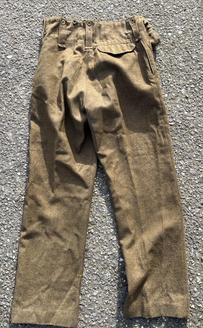 Tunic accompanied by a pair of '40 Patt trousers, again named to Dobbyn with a WD inspection mark, no further marking. Complete with both ankle adjusters and in generally good condition other than the not uncommon moth degradation to the groin and inside leg. Good named uniform to one officer.