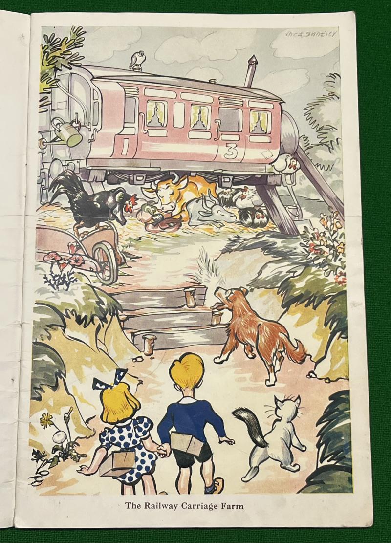 1940 2nd ed. The Evacuees In The Forest. With Pictures by a New Artist For Children - Jack Dunkley. 35pgs with colour illustrations telling the classic story of the evacuees going to the country and their adventures concluding with a visit from their parents. Scarce publication which has unfortunately had some damage to the back cover, contents however, largely clean with some marking, priced to accommodate this. Scarce.