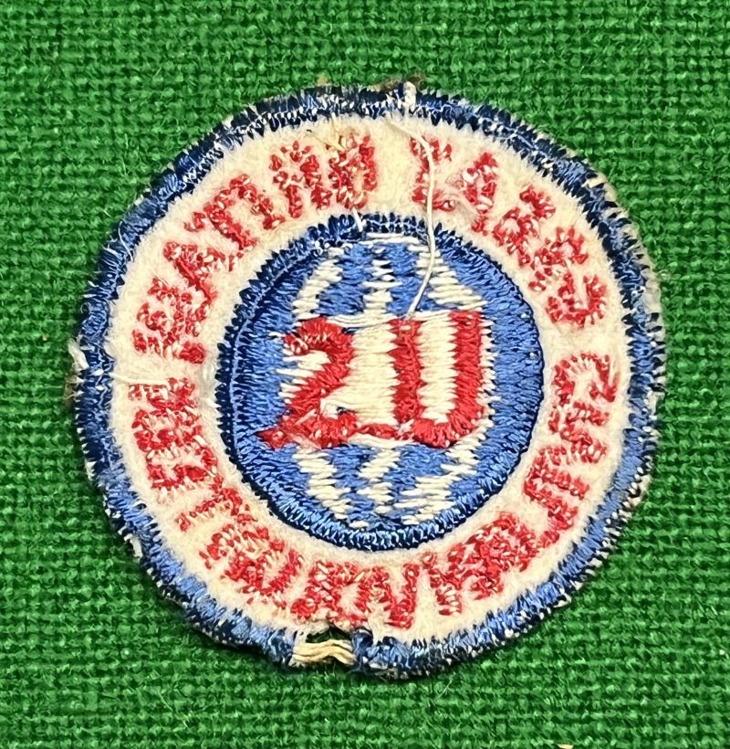 35mm Embroidered badge worn by uniformed British civilian volunteers employed by U.S. forces. Follows the standard construction method of US badges with its merrow edge finish. Clearly removed from a uniform with one moth nip at the 5 o'clock position.