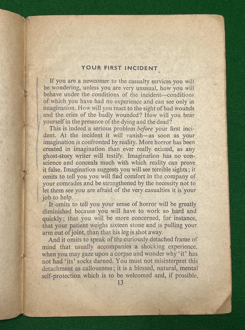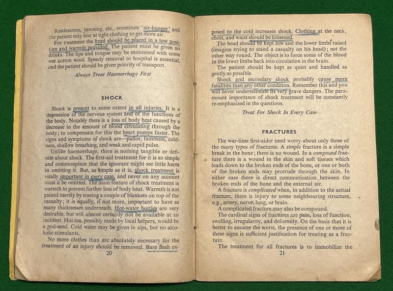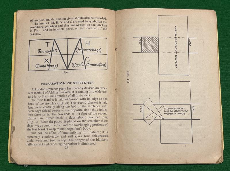1941ed. ' First Aid in Air Raids ' by D.S.Merrick Winn & H.F.Hunt. 55pgs dealing with all aspects of incident first aid from preparing stretchers to gas and dealing with the dead. Takes a fairly robust line to the subject. In good, used condition, with light marking and contemporary highlighting to contents.