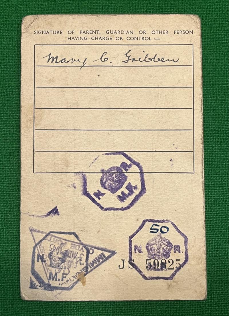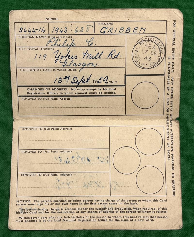 Issued in 1943 alongside the new National Registration cards, the ' temporary buff card for children under sixteen ' was issued at birth or as a replacement in the event of damage or loss. Intended to last until the holder's sixteenth birthday when it would be replaced by the standard identity card, this example, specific to Scotland, issued in1943 to an address in Glasgow with an immigration cancellation to the reverse. Good, used condition, uncommon.