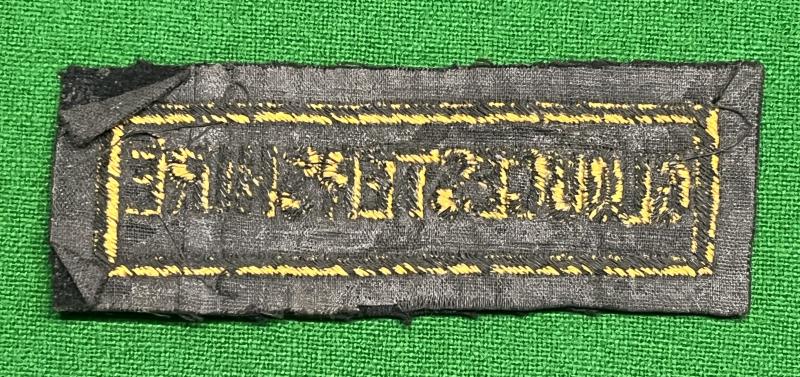 Gold on blue embroidered cotton on wool Civil Defence area title for Gloucestershire. Worn on the breast pocket of the tunic below the CD breast badge. In good clean, used condition.