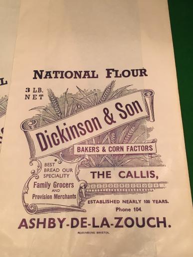 Paper bag for National Flour. National Flour was a blend of flour introduced by the rationing system ensuring that flour was produced to a national standard with a far higher level of wheatgerm than normal. As a result the blend was not as fine as with pre-war standards and retailers were keen to point this out noting it on bags and advertising.