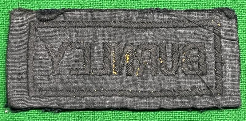 Gold on blue embroidered cotton on wool Civil Defence area title for Burnley, Lancashire . Worn on the breast pocket of the tunic below the CD breast badge. In good clean, used condition.