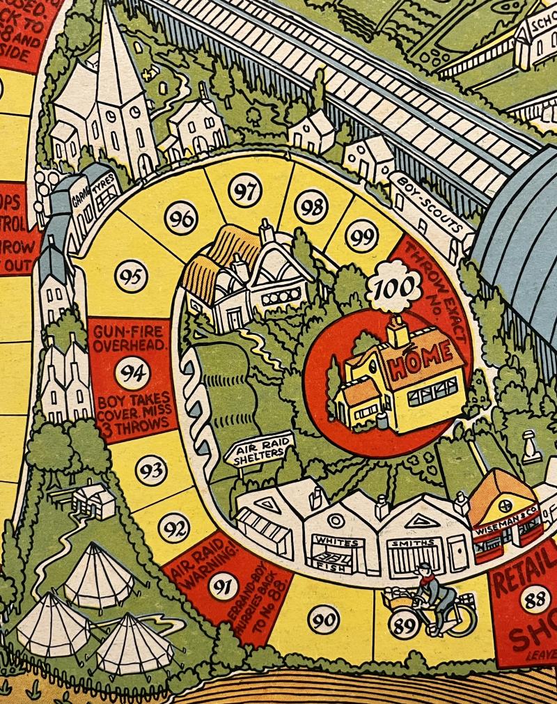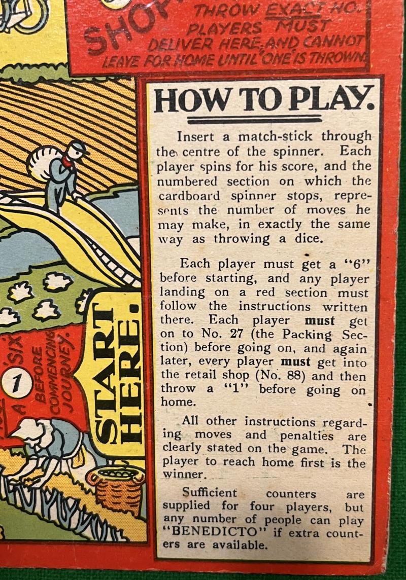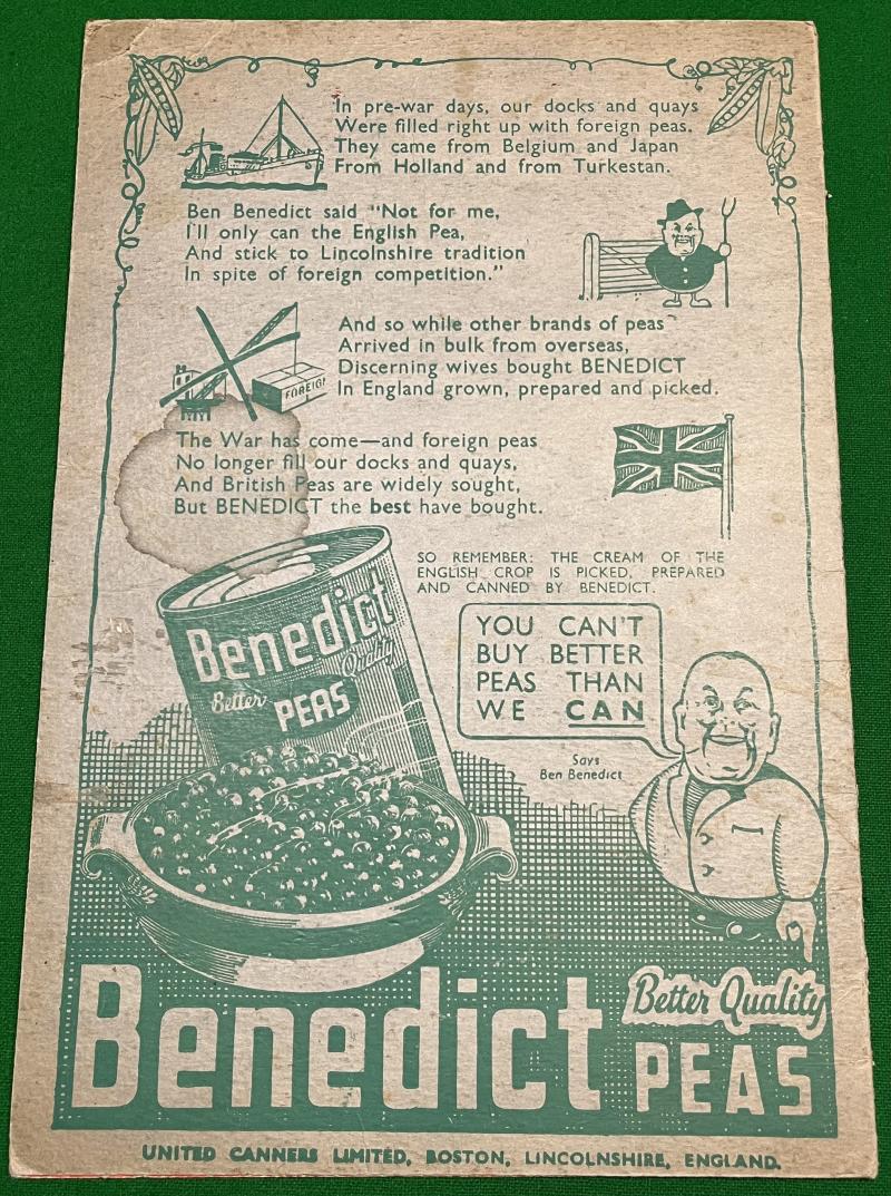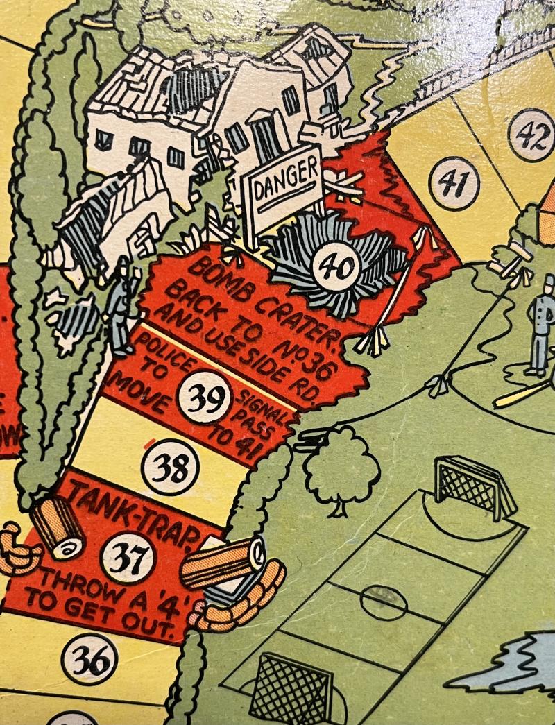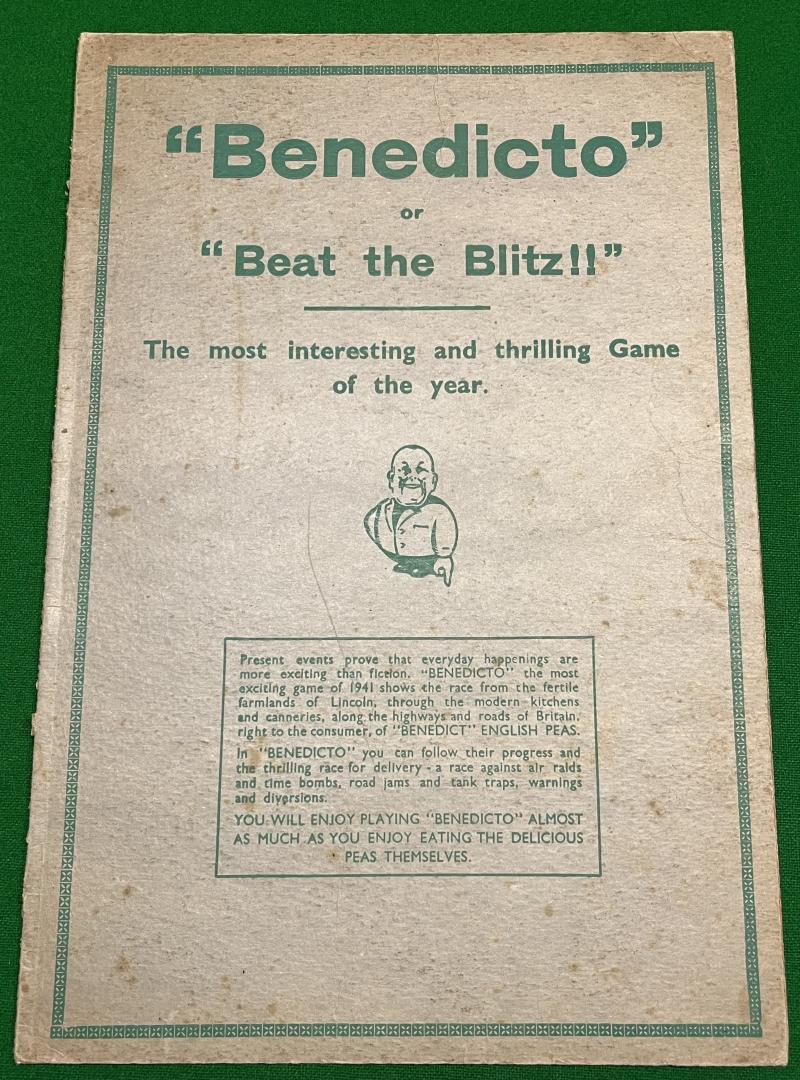 1941 board game given away by the makers of Benedict Peas as a marketing tool. Broadly based on ' snakes and ladders ' the game features the journey of the humble pea from field to shop with such hazards as bomb craters, being turned back by the Home Guard and tank traps to catch the unwary player. In good used conditions with some creasing , rubbing and bumped corners, colourful and unusual.