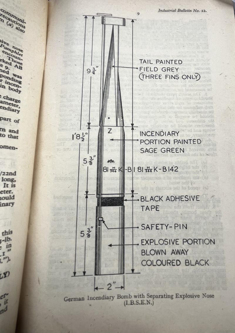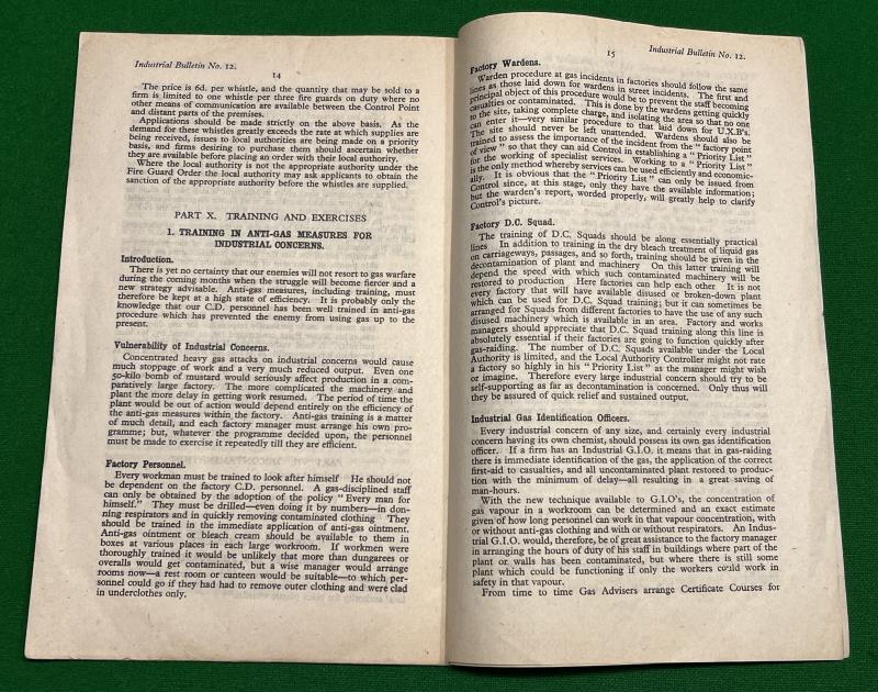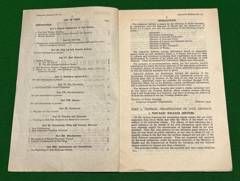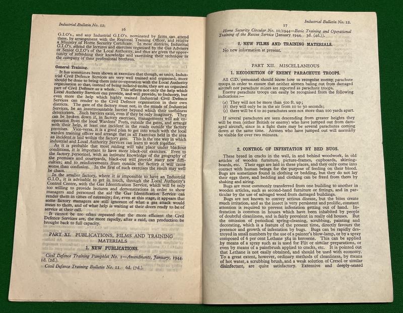 1944, 18pg ARP Industrial Bulletin No.12 produced by the Ministry of Home Security. Classified RESTRICTED, the bulletin covers topics as diverse as recognition of enemy parachute troops, infestation of bed bugs to 2kg I.B.S.E.N. bombs. Good, clean condition with various organisational ownership stamps.