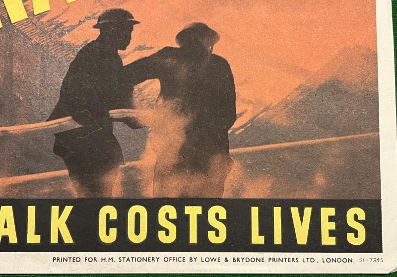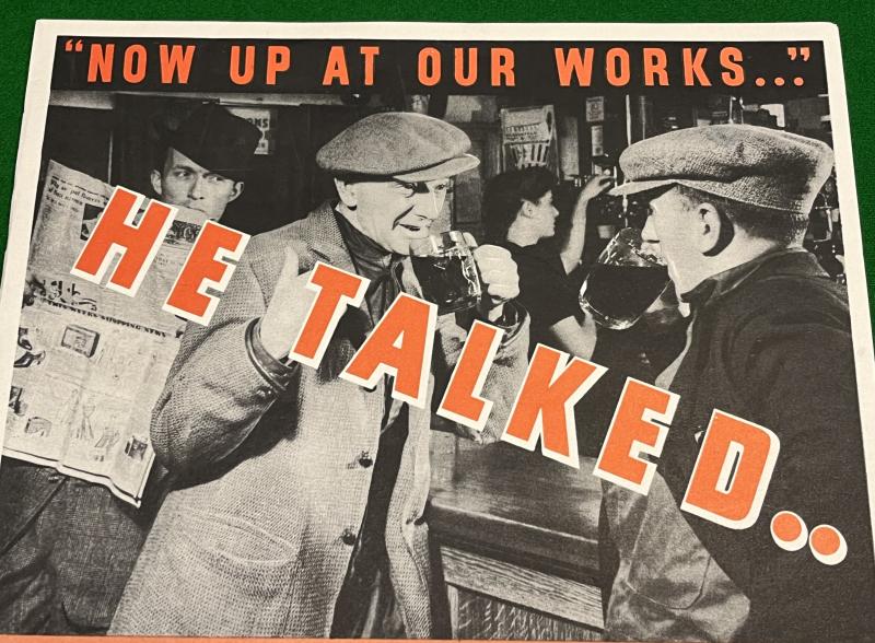 25cms x 38cms poster " Now up at our Works " ' He talked....This happened - Careless Talk Costs Lives '. Printed for HMSO by Lowe & Brydone Printers Ltd. Excellent, clean condition with one minor abrasion.
