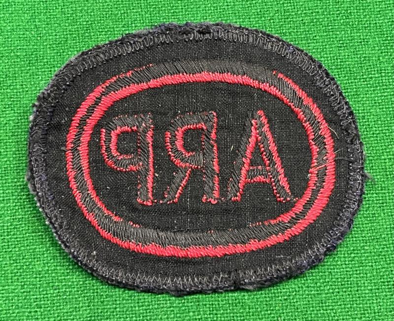 Embroidered cotton on bluette ARP breast badge for use on the overall . Good used condition with evidence of having been removed from a uniform.