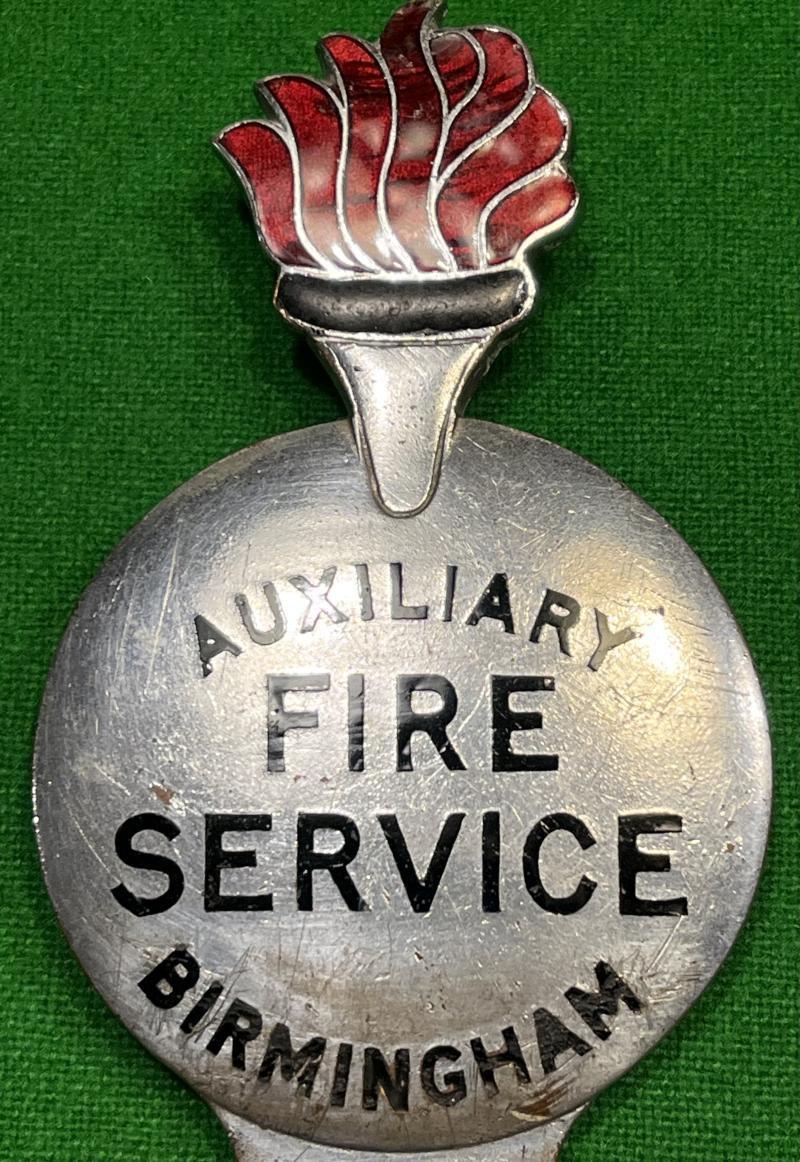 Chrome and enamel car badge for Birmingham Auxiliary Fire Service. These badges were worn on vehicles , not only through a sense of pride but also as an indicator of official vehicles. Worn condition with wearing of chrome and some stress marks to enamel, an uncommon item