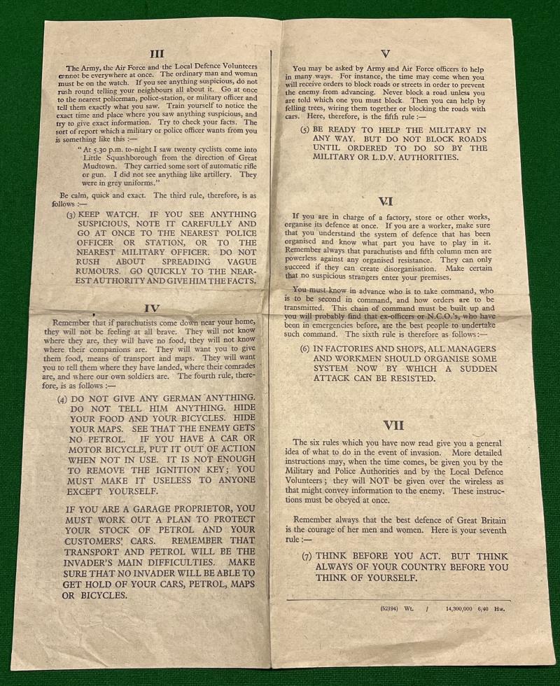 1940 double sided leaflet published by the Ministry of Information and the Ministry of Home Security dealing with the prospect of being invaded. Leaflet draws on experience from Holland and Belgium offering practical advice dealing with the immobilsation of vehicles, the authorities, and instructions in the event of invasion. Good, used condition, has been folded. This leaflet was superseded by the 1941 ' Beating the Invader '.