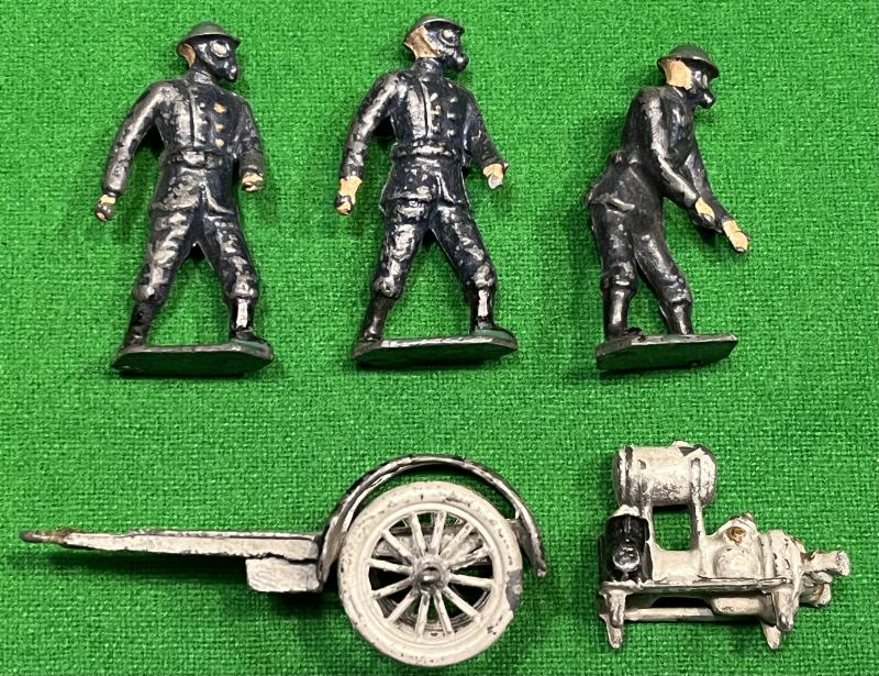 Pre/early War Taylor and Barrett Auxiliary Fire Service Lead Figures. This partial set has three AFS fire fighters with a wheeled trailer pump with lift-off pump. These scarce figures were only produced between 1938 to 1940 with production being halted by the bombing of the Taylor & Barrett factory. Good, original condition with rubbing and wear etc.