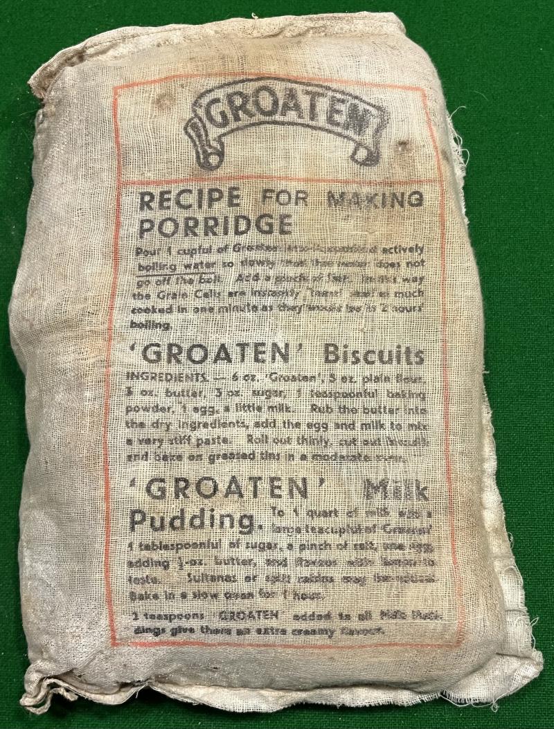 An original pack of porridge oats with contents ! Printed cloth bag marked ' wartime pack ' and ' Pre-packed under Ministry of Food Licence ' with recipe and instructions to the reverse. Contents now solidish and one for the lovers of lumpy porrige ! Uncommon.