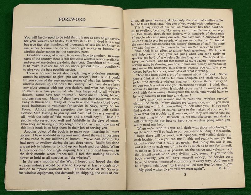 C1941 ' Keep it Going ' published by the Murphy Radio Ltd. 40pgs stressing the importance of the radio in everyday life as the main vehicle of communication and entertainment for the country and the need to maintain them. Based on ' experience gained by radio dealers ' offering hints on maintenance and repairs. Good, used condition with some marking to covers.