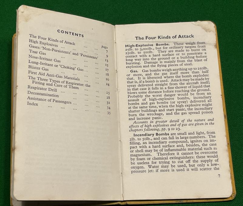 1938ed,35pgs manual for London Transport staff covering the basics of ARP. Starting with an introduction to the staff the manual concentrates mainly on poison gas but includes sections on bombs and assistance to passengers. In good used condition with marking to covers and some damage to interior which does not effect the content.