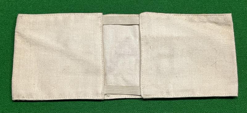 Embroidered canvas armband for use by members of a First Aid Party or First Aid Post. Typical of the style of many of the armbands and much of the insignia provided to many of the CD services. Elastic retainers. Good, used condition with light marking.