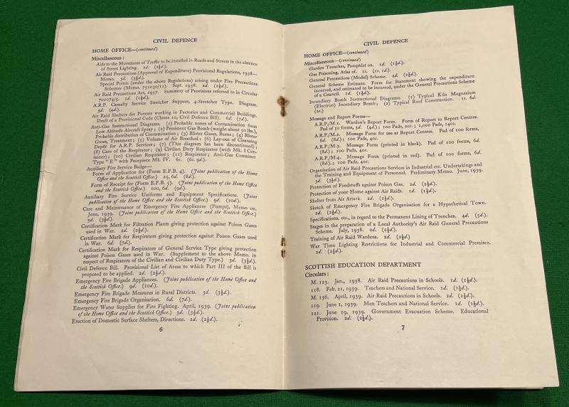 Published and revised to August 1939 by HMSO ' Publications on Civil Defence ' this 10pg pamphlet covers all Handbooks, Memoranda and Circulars. Also includes publications by the Scottish Office and various other Parliamentary departments. Good, slightly foxed condition. Useful and uncommon reference and is a good indication of the level of preparedness at the outbreak of war.