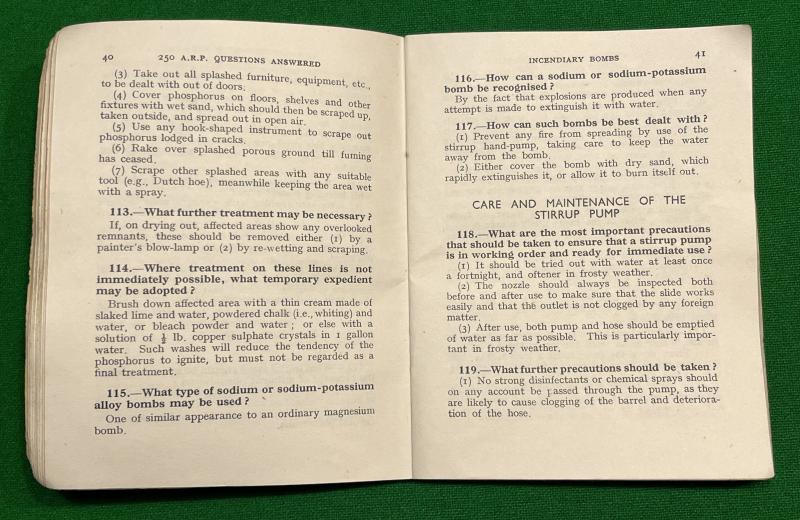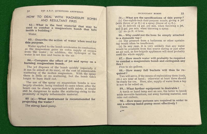 1943ed. ' 250 Questions Answered ' by R.F.Reynolds and J.M.Young. 75pg booklet dealing with HE and Incendiary bombs, war gases and first aid. Some diagrams. Good, used condition with light creasing, marking etc.