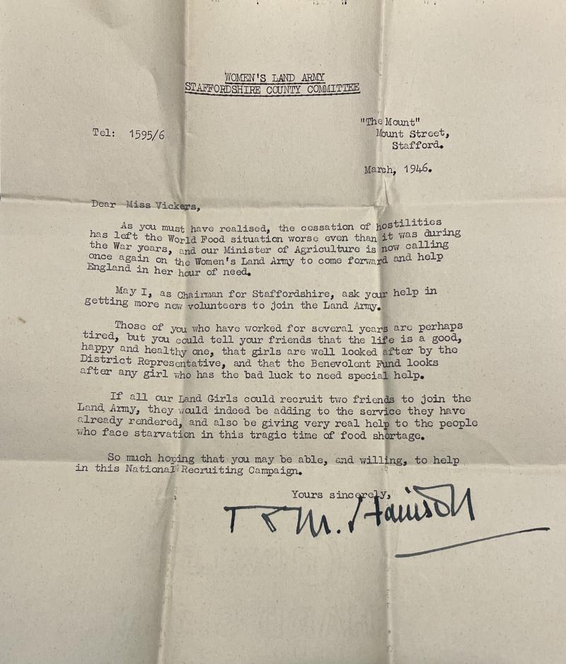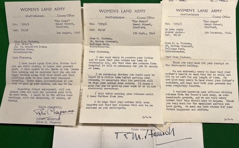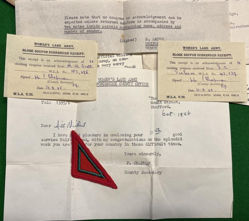 A grouping of insignia and correspondence to a Miss F.Vickers concerning the end of a long service in the WLA. Included is the last of her six month chevrons and accompanying letter having served for 5 1/2 years at this point along with her gilt and enamel WLA badge. Correspondence deals with end of her service and reading between the lines Miss Vickersis coming up with various reasons to terminate her service despite attempts to retain her. The Release Certificate and benevolent leaflet tell their own story. All items in good condition.