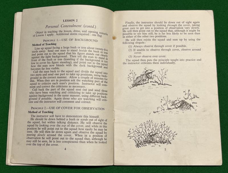 C1942 ' How to Teach Battlecraft ' by Capt.R.A.Humphrey. Published by Gale and Polden and featuring a colourful cover, and sketches by the well known artist Ardizzone. 20pgs covering subjects from ' movement at night ' to ' tactical crossing of obstacles '. Good, used condition with some light marking and rusting to staples.