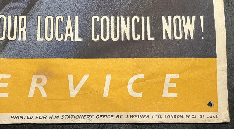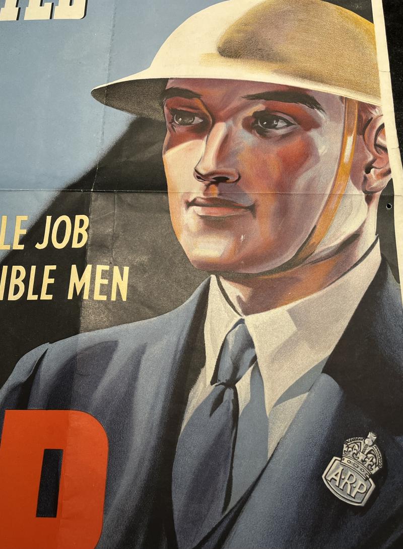 Original 51 x 76cms poster ' Air Raid Wardens Wanted ' by the artist ' Goodfellow ' featuring a suitably stylised mage. Part of the early ARP recruiting campaign ( A.R.P.7 ) this poster was printed for HMSO by J Weiner Ltd, 71/5 New Oxford Street, London WC1. This scarce survivor has clearly been displayed, showing glue marks to top and bottom of reverse with a series of mounting holes, small, repaired tears and creases.