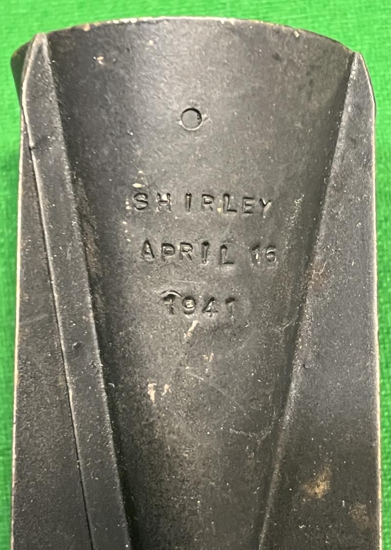 Tail fin from the standard German 1kg incendiary bomb taken as a souvenir in 1941. Now painted black with the inscription ' Shirley April 16 1941 ' stamped to the top of the fin. Shirley is part of the Metropolitan Borough of Solihull in the SE of the greater Birmingham area.