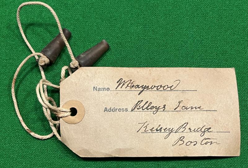 Gas mask label issued by Holland County Council ( Lincolnshire ) A.R.P. dept. indicating size and ownership. In this example made out to a Boston address. Accompanying the label is a set of rubber ear plugs of the pattern frequently found with civilian gas masks. Both of these examples were taken from a severely perished gas mask that was thrown away.