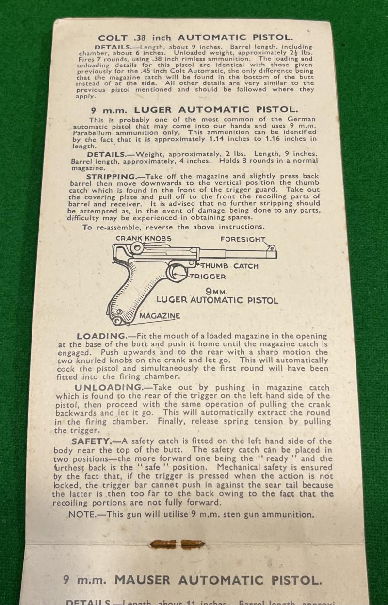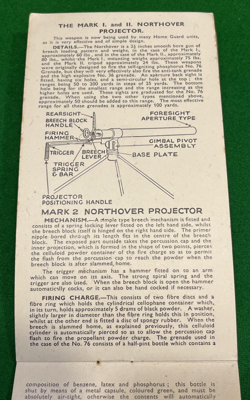 Commercially printed, pocket book size manual of ' Small Arms & Special Weapons, for Home Guard and Service Use.' Published by Bernards Ltd, London the manual features a large number of diagrams and sketches of weapons including foreign weapons, grenades, Northover Projector and anti-tank weapons. Good, used condition.