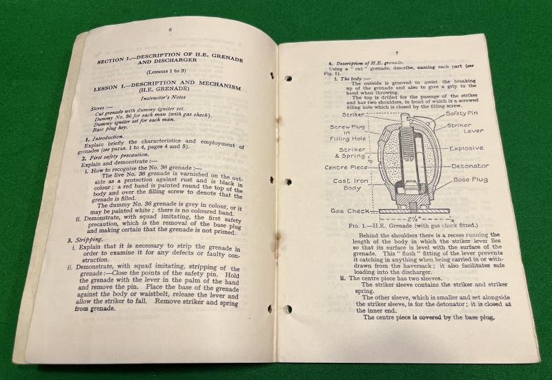 1937ed. SAT Vol.1 No.13 Grenade and amendments. 48pg manual covering the No.36 grenade, the cup discharger and the use of the grenade. Illustrated throughout with sketches and diagrams. This example has an ownership stamp for ' 11th Maidstone Batt Kent Home Guard No.2 Kent Group ' and a Jun.1941 issue date. Good, used condition with replaced staples and some rust staining.