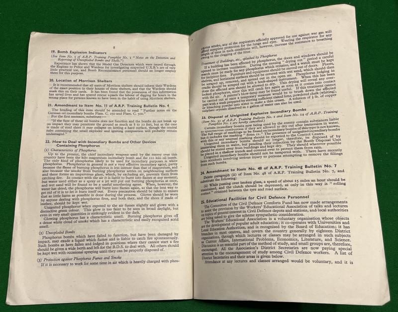 1942/1943ed. Min. of Home Security Civil Defence Training Bulletin No.9. 12pg pamphlet giving updates and new information regarding all subjects of Civil Defence including gas notes for Wardens, Incendiary bombs, Morrison shelters, Livestock Emergency Service. Good, used condition with some light marking.