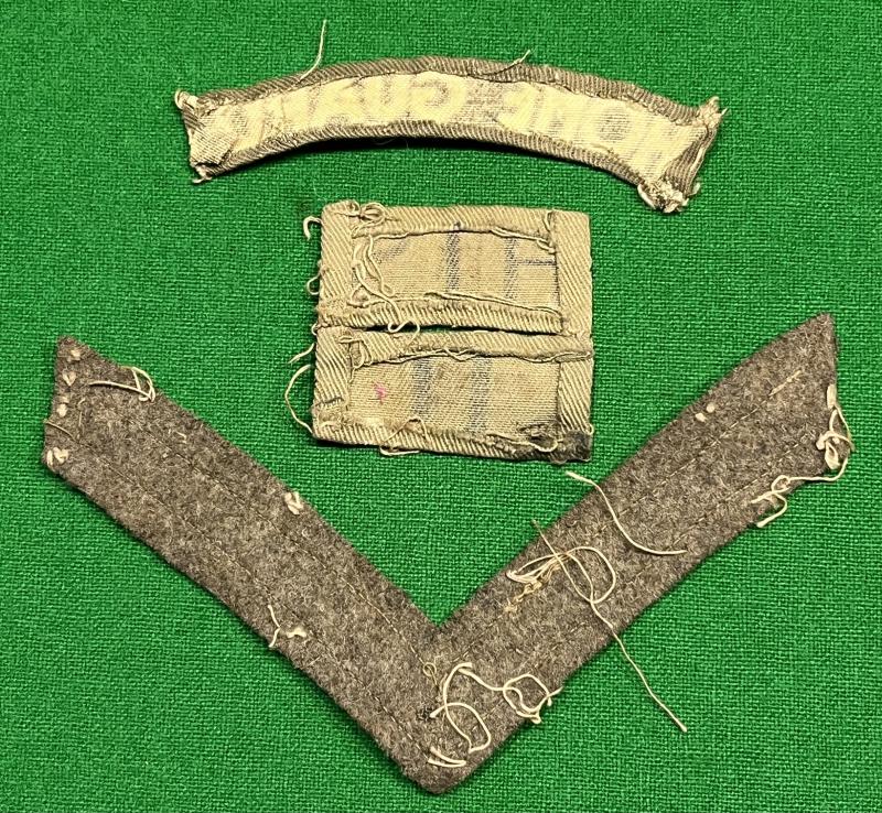 An ' arm ' of insignia from the uniform of a member of the 11th Hertfordshire (Bishop's Stortford) Battalion Home Guard. Printed ' HTS11' battalion titles with accompanying printed Home Guard shoulder title and embroidered Lance Corporal's rank stripe. Clear evidence of having been removed from a uniform and in good, used condition.